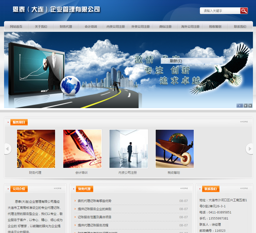 網(wǎng)站制作欄目要求:網(wǎng)站首頁 關(guān)于我們 財務(wù)代理 會計培訓(xùn) 內(nèi)資公司注冊 外資公司注冊 商標(biāo)注冊 海外公司注冊 稅收籌劃 聯(lián)系我們